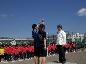 標記大会において、男女ともに優勝し、男女キャプテンが学校長に報告しました。