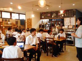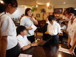 9月3日(火)1年生の「特産物」探究グループでは「千曲市の特産、あんずをもっと広めたい」とあんずを使った商品開発をしています。今日は、探究活動にご協力をいただいている「和かふぇ よろづや」さんにお伺いし、これまで考えたレシピにアドバイスをいただきました。「バターとクリームチーズはどちらも原価が高いし、クリームチーズを入れると日持ちがしないかな」「米粉で代用するとパウンドケーキが思っているように膨らまないかも」「販売することを考えて、小分けにできるようにした方がよいよ」と料金設定や、日持ち、レシピの再現性などアドバイスをいただきました。生徒たちはこれまで「みんなが楽しんで食べられるもの」「たくさん作れるもの」など考えてレシピを準備してきましたが、「なるほど~」「そういうことも考えなくては・・・」と頭を悩ませていました。試行錯誤をしながらつくり上げることを楽しんで納得の一品を完成させて欲しいです。