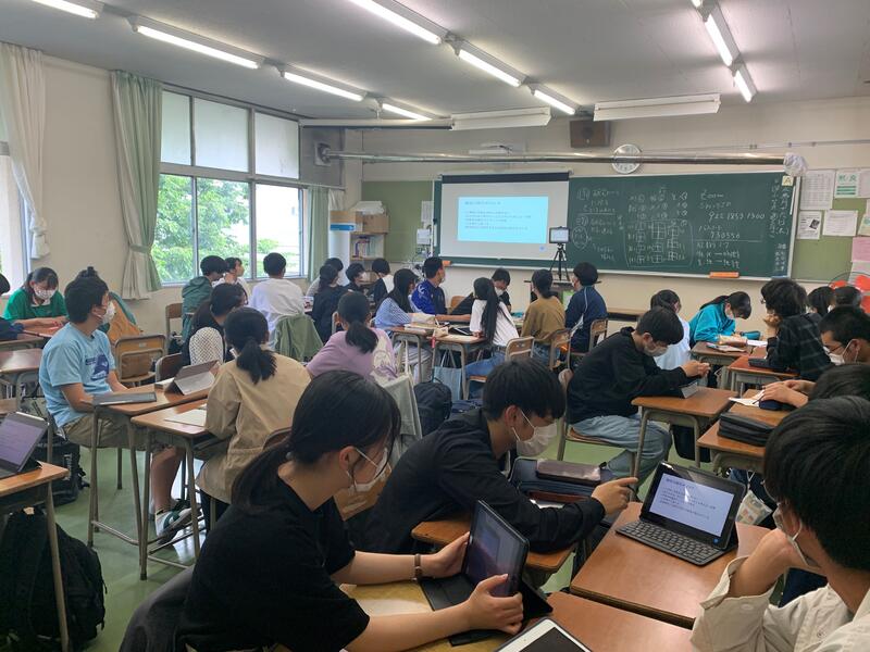 2年理数科が取り組んでいる課題研究をより充実したものにするために、構想の段階で、講師にオンラインで相談してアドバイスを受ける会を、今年度初めて実施しました。講師の方々は大学の様子や高校時代の時間の使い方、課題研究が大学受験にどのように繋がっていくか等、様々な視点から生徒にアドバイスをしてくださいました。
