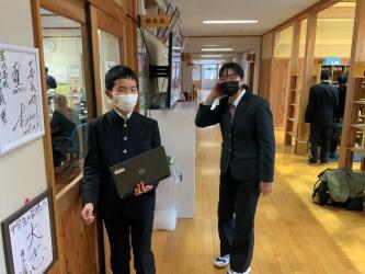 〇2月14日(月) 3連休明けの月曜日。1年と3年の分散登校日でした。放課後、下校をする生徒の皆さんに声をかけると、気持ちは17日からの定期考査に向いているようでした。残って質問をする人や、「今日は帰ってから●時まで頑張る!」という人もいました。そんな中、職員室のドアをたたく二人の姿。端末を片手に、何か仕事をしているようでした。テスト近いのに、頑張っているねと声をかけると、やりがいをもって仕事をしている様子が伝わってきました。