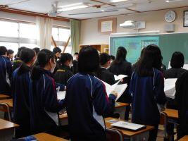 2月9日(金)現在、附属中学校の朝は歌声からはじまります。今朝も、有志で集まった生徒たちが、総合文化発表会で歌う全校合唱「僕のこと」の練習をしていました。学年、性別問わず、参加したい人が自由に参加します。教員も参加します。歌声を聴いて人が一人、また一人と増えていきます。そんな自由で温かな雰囲気も附属中学校のよいところだと思います。その歌声も日に日に力が増してきました。参加していた生徒が言っていました「やっぱり歌は気持ちがいい!」。(3枚目の写真は教室での練習の様子です)