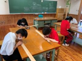 〇8月10日(水) 生徒会全校制作プロジェクトチームの皆さんが、手作り時計を制作するための下準備をしてくれています。ミリ単位をしっかりとはかって、ていねいに四角いチップを切り出していました。「実は苦手なんです!」と言いながらも、一生懸命制作にかかわろうとしている姿がとても美しく感じます。実は技術室はエアコンがないので、暑い中本当によく頑張ってくれました。