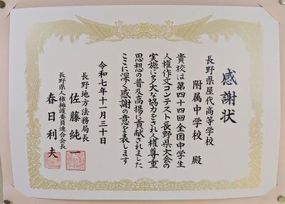 過日行われた「第44回全国中学生人権作文コンテスト長野地区大会」において、本校では、優良賞1名と奨励賞5名が受賞しました。