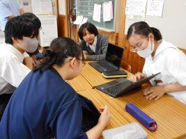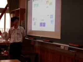 企画、運営全て生徒が行い、各クラス、4人グループでアイディアを出し合う場面では、生徒会本部役員がクラスに1人ずつ入り、方法を説明したり、話し合いが滞っているグループには「次は、こんな感じにやってみて」と声をかけたりして進めていました。また、縦割りのグループでは、初めて顔を合わせたメンバーにも関わらず「私たちのグループは・・・」と堂々と発表する姿がありました。授業で、自分の意見をまとめたり、表現したりしてきた成果が今日の話し合いでも生かされていました。