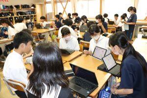 7月24日(水)生徒会の時間に全校で、生徒会活動の議題に関するブレインストーミングを行いました。「地域から愛される生徒・学校になるためにはどうしたらよいか」「清掃のやる気がでるようにするには」など、各委員会から出された議題に対し、①4人グループでアイディアを出し合い、②意見をまとめ、③異学年の縦割りグループで情報交換をし、④文章にまとめて各委員会へ提案をしました。
