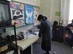↓放送室でマイクの前での挨拶の様子