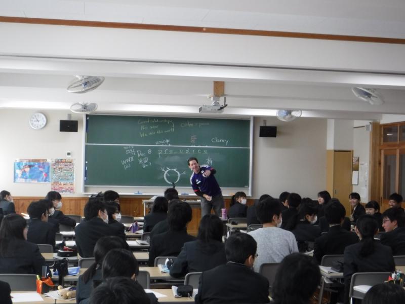クリスさんは外国出身ですが、今の中学生が生まれる前から日本で暮らしています。しかし、日本に住む私たちの多くは、その外見からすぐに「外国人(=日本のことをよく知らない人)」と判断します。そのような「偏見(prejudice)」が、平和を脅かすきっかけになるのかもしれません。今日の授業を通じて、自分の中の様々な偏見を改めて考える機会になりました。