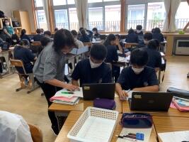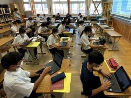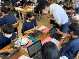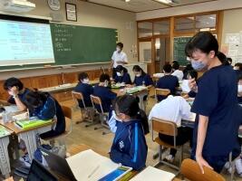 〇8月23日(火) 国語と数学と英語の授業を5校時に見に行きました。今日の授業参観のキーポイントは「協働的な学び」。どの授業も、友と協働的に学んでいる場面が見られました。「一人一人の生徒が、自分の良さや可能性を認識するとともに、あらゆる他者を価値ある存在として尊重し、多様な人々と協働しながら様々な社会的変化を乗り越え、豊かな人生を切り拓き、持続可能な社会の創り手となることができるように資質・能力を育む」、令和の日本型学校教育の目指す姿にこう書かれています。他者とのかかわりはどうも必要不可欠なようです。そのための資質・能力も日々の授業内で身に付けたいですね。