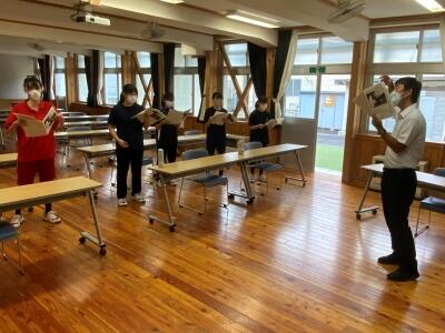 〇8月26日(金) 朝学校に着くと、「僕のこと」の合唱が聞こえてきます。講義室では、1年生、3年生、M先生が練習していました。よくみると、なんと合唱班の人たちでした。学年の歌練習のための練習だったそうですが、歌うことを楽しんでいる姿が全校にひろがっていくとよいですね。