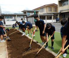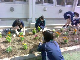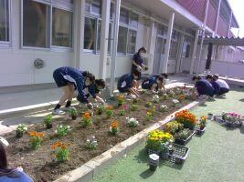 6月21日(水)中庭の花壇に新しい花が並びました。冬の花から、マリーゴールド、百日草、日々草など暑さにも強く、長く楽しめる花に植え替えです。環境委員の皆さんを中心に、朝読書までの短時間を使って、土を耕したり、花を植え替えたりしてくれました。今日は花植え。あっという間にきれいになっていたので驚いて、委員長さんに尋ねてみると「委員だけでなく周りにいた人たちも手伝ってくれた」とのこと。残念ながら、私はその場には立ち会えませんでしたが、皆で協力し、素敵な朝の時間となったに違いありません。