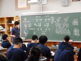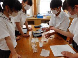 6月28日(水)本校の授業の特徴のひとつに、中学3年生の理科の授業の分野別指導があります。3年生では、理科の授業をα(物理・化学)とβ(生物・地学)の授業に分け、βは高校の先生が指導をしています。今日は、遺伝子についての学習で、エンドウ豆の形と色がどうなるかについて考えました。生徒たちは次にできるエンドウ豆は「緑じゃないか」「黄色じゃないか」と予想しながら学習を進めていました(中には、授業が終わった後も、先生と議論をしている生徒もいました)。2年生の授業では、化学変化が起こる前後の質量について調べていました。Aさんが「ペットボトルの蓋を開けたら二酸化炭素が出て軽くなるのではないか」と予想し、やってみるとシューッと二酸化炭素が抜け、確かに軽くなりました。科学の知識があると私たちの身の回りの現象に対する見方も変わりますね。