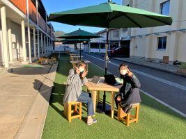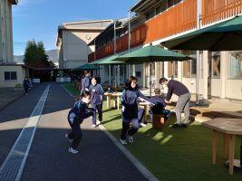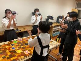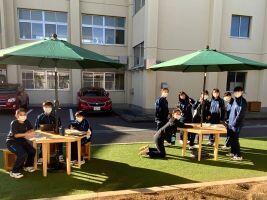 〇10月28日(木)  朝、昼、放課後、今日はウッドテーブルで勉強したり、お話したり、歌練習したりなど、様々な使い方をする様子が見られました。8期生の先輩も勉強に使っていて、思った以上に7つのウッドデッキのまわりに生徒の皆さんの笑顔が集まりました。記念品をウッドテーブルにして本当によかったと思っています。夜露や雨にも耐えられるように、K先生が、カバーを検討してくれました。木は手入れ次第で長持ちします。これから10年以上先の生徒の皆さんも、気持ちよく使ってもらえるようにしたいですね。