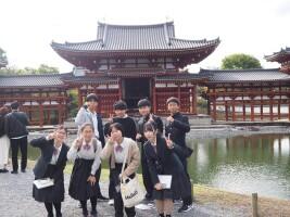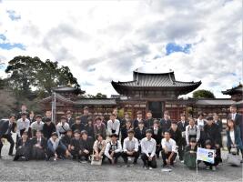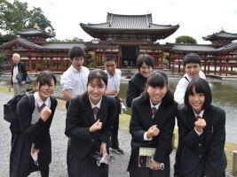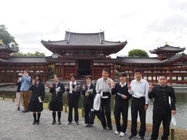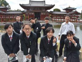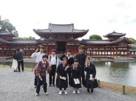 〇10月18日(火) 修学旅行1日目。どこへ行っても、にぎわっている京都。マスクはしていますが京都の日常が戻っているようでした。風が少し冷たく感じましたが、とても見学しやすい気候でした。B組と一緒に平等院を見学すると、鳳凰堂の阿弥陀如来様の神々しさ、雲に乗り、楽器を奏で、舞を踊る雲中供養菩薩様の繊細な彫刻像に圧倒されました。「先生、腕のところにある布のようなものを彫るのってどうやっているの?」質問した生徒の皆さんの目は、ホンモノに触れ心を揺さぶられているとてもよい目をしていました。ホンモノ、しかも国宝に触れるということは、大切なことなんだなぁと感じました。質問の答えは、もちろん、答えられませんでしたが、ああでもない、こうでもないと生徒のみなさんと考えを交わしたことは、今日一番のうれしい瞬間でした。