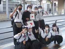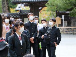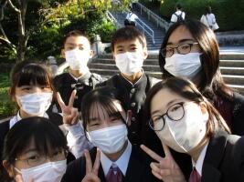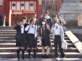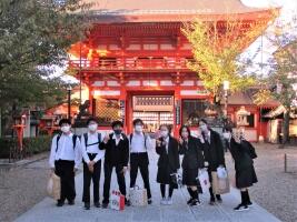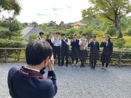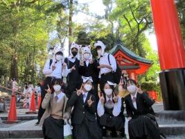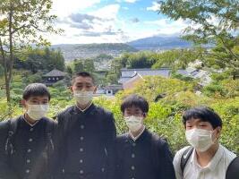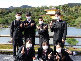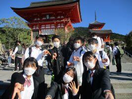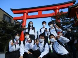 〇10月19日(水)  修学旅行2日目。これでもかというぐらい快晴で、班別見学をとても気持ちよく行うことができました。本部への連絡もほとんどなく、予定していた行程を班内で相談し、進めることができたようです。夕方5時過ぎに、宿舎に戻ってきたときは、きっと疲れて帰ってくるかなと思っていましたが、とても充実した表情で帰ってきました。キツネのお面や扇子、良い香りのする石鹸や木刀(?)など、思い思いにお土産を買えたのも相当楽しかったようです。明日は、奈良へ全体で向かいます。京都とはまた少し違う奈良の文化を感じ取ってほしいと思います。