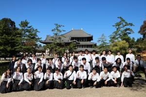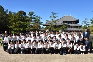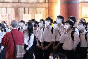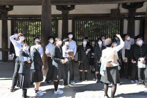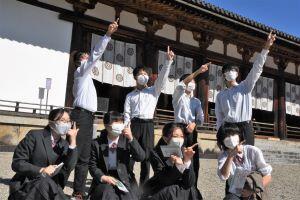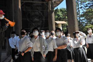 〇10月20日(木) 修学旅行3日目。本日も青い空の下で、日本最古の木造建築と、日本最大の木造建築を見学することができました。今日は、朝から予定通りにはいかず、車の渋滞に巻き込まれたこと、そして、修学旅行が一気に復活し、見学者が思った以上に多かったことにより、帰着時間が1時間遅れてしまいました。それでも生徒の皆さんは、慌てずに五感を使って見学したり、逆に友と一緒にいる時間が増えたので旅行を楽しんだりしていました。生徒のみなさん、学年の先生方全員でつくり上げた思い出深い旅行になりました。
