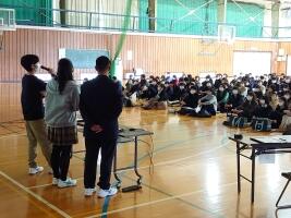 〇10月29日(金)  応援委員会の皆さんによる新人大会の壮行会、今回は北信越大会にのぞむテニス班の壮行会を行いました。テニス班の皆さんの挨拶から、周りの方への感謝の心が伺えます。応援委員や生徒代表でエールを送ったNさんからは、仲間を応援したい心が見えました。短時間の場ですが、形式的にならず本当に素敵な瞬間に感じました。