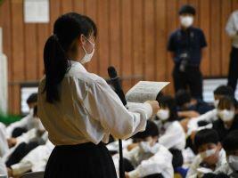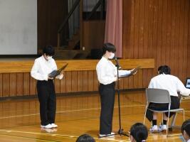 〇10月3日(月) 終始業式を6校時に参集で行いました。馬場校長先生からお話をお聞きしたり、各学年代表の生徒が発表したりしました。校長先生からは「自分ごととして他の人と違うことを考えよう」「驚きや感動を大切に」「失敗を恐れずに取り組んでほしい」後期からすぐ実践できる姿を示して頂きました。また、「今こうして全校の前で話をすること自体が、私にとってはものすごいこと」と話した2年生のIMさん。自分の力を、内から外へ出すことができた素敵な日になりましたね。後期、さらなる高みを目指して頑張りましょう。