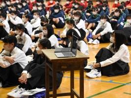 〇10月1日(土) 令和5年度入学者選抜説明会を行い、大勢の方にご参加いただきました。参集で実施をしましたが、体育館の1会場ではなく、敢えて複数の教室を使ってオンラインでの実施としました。それは、「体育館に座ってもらって、少し薄暗い中資料を見ていただくよりは、教室で椅子に座ってもらって、資料をみやすくしたほうが、おうちの方にとってもよいのではないか」という意見によるものです。教室のネットの環境が整い、オンライン会議が可能になった利点がここにもあると感じました。参加された方の様子を伺いながら説明できないのは少し残念ですが、始まる前に教室に行き、空気を感じ取らせて頂きながら説明させていただきました。志を持ち、将来の夢の実現へ向け、屋代高等学校附属中学校の入学者選抜を受検する皆さんに心よりエールを送ります。
