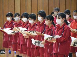〇10月31日(月)  応援委員会による新人大会の壮行会、今回は卓球班と、体操に参加するYさんへの激励しました。個人で出場するYさん、夏の大会でも手の指先から足のつま先まで美しい演技をみせてくれました。新人大会でも日々練習を重ねた成果を発揮して欲しいと願っています。卓球班のみなさんは、なんと大会が11月5日。記念式典と重なってしまいました。私たちとすれば、記念式典も卓球班の皆さんの分まで頑張りたいと思っています。卓球班のみなさんは、当日までは記念式典に向けての練習も頑張ってもらいますが、大会当日は、記念式典のことは忘れて、試合に全集中し県大会を目指して頑張ってください。応援しています。