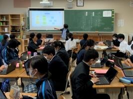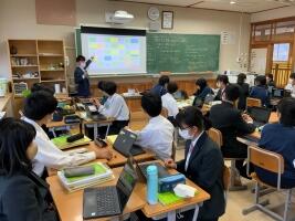 〇10月26日(水) オンライン授業・探究学習日は3年と1年で学校以外の所から配信した授業を行いました。幸い天気がとてもよかったので、オンラインで見ている生徒の皆さんも気持ちよかったのではないでしょうか。地域の教材を活かして、しかも国語のと数学のコラボ企画は興味深い授業でした。数学的に解くのか、漢文を読み解きながら答えを出すのかを選択できる点もよかったですね。生徒目線の授業が実践されていました。それを裏付けるのが、現地にかけつける生徒がいる所。3年では二人、1年では一人がかけつけてくれました。そんなことができるのもオンライン授業日のよさ。より主体的に、より深く学ぶことができました。