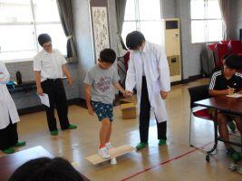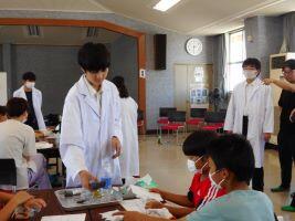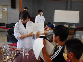 8月1日(木)屋代公民館で行われている「子ども科学教室」に科学班の生徒が講師として参加しました。「身近なもので電池が作れるか」という実験では、レモンやスポーツ飲料、油、炭酸水、スライムなどで電池が作れるかどうかの実験をしました。生徒たちは、分かりやすい言葉で丁寧に説明をし、「みんなどう思う?」「電気通るかな?」「やってみたい人?」と参加した小学生に積極的に話しかけていました。「紙コップの上に立てるか」という実験では「乗ってみたい」という小学生が成功すると、皆で拍手をして盛り上げました。参加した小学生も「楽しかった!」と口々に言ってくれ「先生」としての役目をしっかり果たした生徒たちでした。