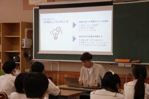 8月24日(土)附属中学校では、隔年で附属中学校を卒業した先輩と保護者の方をお招きし、中学時代の生活や学習について、進路選択についてお話をお聞きしています。今年度は、現在、金沢大学、東京大学に通う2名の先輩が来校してくださいました。話を聞いた生徒は「課題を解決するために必要な『積み上げ思考』と目標を達成するために必要な『逆算思考』を考えるということを実践したい。」「進路を絞りきらずに、興味がある様々なことに挑戦する時期なのだと思った」と先輩の言葉が心に響いたようです。また「お家の人がこんな風に子どものことを思っているなんて始めて聞いた。すごくよい機会だった」と話してくれた生徒もいました。