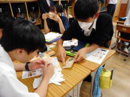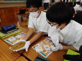 8月30日(金)本日と来週月曜、3年生は社会科の時間に「金融教育」があります。講師は、八十二銀行と八十二文化財団の皆さんです。第1回目は「貨幣の歴史」を学習しました。貝殻を用いた貝貨、教科書にも出てくる「和同開珎」豊臣秀吉がつくった天正大判など昔の貨幣を手にし、生徒は教科書に載っている写真や説明と比べたり、「思ったより重い」と感触を確かめたり、写真を撮ったりしていました。また、新札に隠された偽造防止技術を教わり「こんなところにも文字が書いてある!」と驚いていました。それにしても目がよく、ルーペを使わなくてもNIPPON(日本)の文字をどんどんと見つける生徒たち。すごいなぁ・・・。次回は「為替と資産形成」についてを学習します。