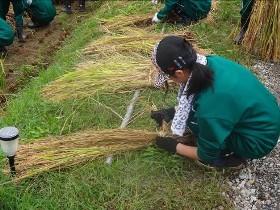 - 一番つらかったことは、刈り取った稲を縛ることです。紐の絞め具合が大切です。緩いとダメ。きつく縛ると自分が最後にくるくる巻いたものを入れる時に苦労します。爪がはげそうになりました。米は大変苦労して作ることを改めて実感しました。