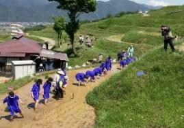 5/27(土)に、中学2年生が姨捨の棚田で田植え体験を行いました。当日は、千曲市の「棚田貸します制度」のオーナーの皆さんが揃って田植えイベントであり、県内はもちろん、県外からも大勢の方がいらっしゃっていました。