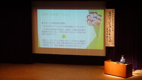 一人目は、2年時に学年として行った「千曲市活性化プラン」を発展させた研究です。発表者は、調査を通して千曲市の若年層の少なさに気づき、それらを解決するための案として「大学や企業との連携」を考えました。その具体例の一つが「農業大学校の出張授業」です。農業大学校の誘致そのものは費用面で困難なため、参加することで授業と同様の単位認定ができ、商店街の活性化にもなる「ちびっこ商店街」の実施を提案しました。