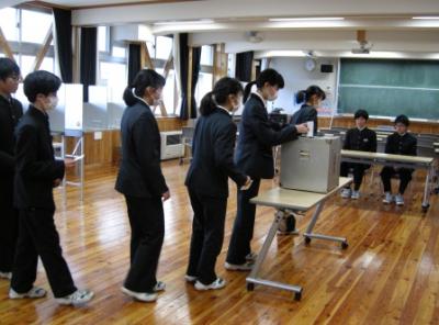 生徒会役員選挙が行われました。当初は立ち会い演説会を行う予定でしたが、インフルエンザの流行に対応するため、校内放送による「演説」となりました。また、早退する学級は特別に2時間目に投票を行うなど、特別な対応となりましたが、無事に投開票を済ませることができました。「心を配れる生徒会」、「過ごしやすい学校」の実現に向けて、一歩一歩進んでいくことが楽しみです。