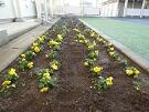 校舎前の花壇では、パンジーが可憐な花を咲かせています。