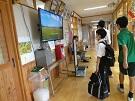 玄関の大型テレビには、自作のパワーポイントや動画、学びの様子の写真が提示されています。