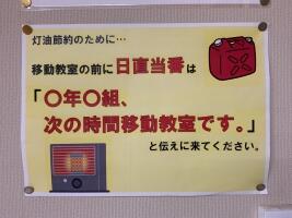 〇12月21日(火) 「意気に感じる」・・・副校長室にいると、「〇年〇組ですが、次の時間移動教室なのでストーブ止めてください。」といった生徒の声が聞こえてきます。今年は灯油が高いので、節約しようという話になりましたが、生徒も本当に丁寧に取り組んでくれています。そこで、生徒を動かしているものは何だろう?と疑問をもちました。放課後、教室に行き、一番左の写真の掲示物を見つけたとき、「なるほど!」と思いました。生徒が掲示物を見て、いつでもストーブを消す意味が理解できる...。生徒が意気に感じて動くには、まず先生方がどのくらい意気に感じて取り組んでいるかが大きく関係します。そういった視点で見ると、廊下に設置された学習プリントが整理されていることも、図書館の机がきれいに飾られていることもそうであるように、生徒が意気に感じて動けるように、数多くの仕掛けが先生方の手によってなされています。本当に感謝ですね。ありがとうございます。