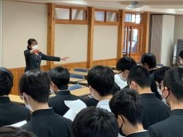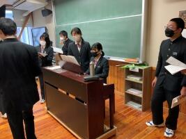 〇12月24日(金) 年内最終日。お昼休みに気持ちのこもった歌声が講義室から聞こえてきました。昼休みのわずかな時間を使って、3年生が練習していました。Tさんの指揮に呼応して、Kさんの伴奏、そして3年生全員の気持ちが乗っている感じがしました。私とすれば、年内最終日に素敵なクリスマスプレゼントを頂いた気分です。ありがとう。本番も楽しみですが、毎日こんな素敵な歌声が聞こえてくることに、ものすごく喜びを感じます。これからも、いっぱい歌って聴かせてください。日々の成長の過程を、とても楽しみにしています。