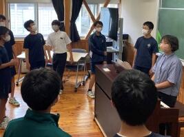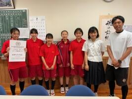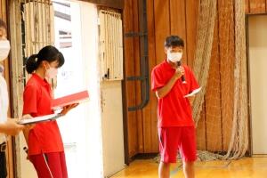 中体連県大会で第6位に入賞したバタフライのOJさん、自由形のOTさんへの表彰を行いました。力一杯泳いでいた姿がとても大きく見えたことを伝えました。おめでとうございます!