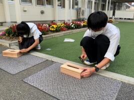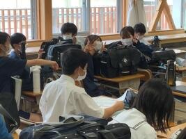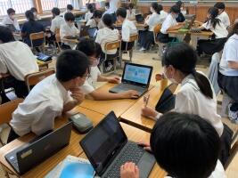 〇7月26日(火) 暑い一日でしたが、1年生は技術の作品(ティッシュボックス)、統計グラフコンクールをまとめる準備をしていました。一人一人の活動が中心の授業でしたが、オンラインで入室している生徒と会話したり、チャットで困っていることや質問を言い合ったりして時を共有していました。となりにいなくても、端末を通して時を共有できることが当たり前に行われていることに、改めて時代の変化を感じてしまいました。