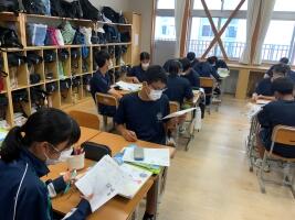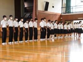 〇7月25日(月) 6時間目は各学年総合的な学習の時間。1学年では9月の宿泊学習に向けての学年集会が行われ、係ごとに必要なことを発表していました。生徒主体に取り組んでいる様子が伺える集会でした。3学年では、10周年記念式典の歌練習が始まっておりパートごと前向きに取り組んでいました。場所がなく、廊下も使って密を回避しながら一生懸命高い音と勝負していました。あと二日で夏休み。暑い中ですが、みんなよく頑張っています!