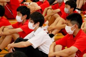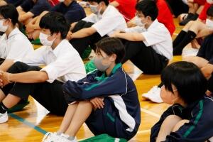 〇7月12日(火)  6時間目終了後に、携帯電話の通学時所持にかかわる全校集会を開きました。6月末に実施したアンケートの結果の共有し、これまでどんな経緯でこの取組が始まったのか等話す時間を頂きました。「なぜ中学校は携帯電話の持込みは原則禁止とすべき」となっているのか、私なりに話をさせて頂きました。自分の意志で、自分の欲望とか願望とか衝動をコントロールできないこと(自分を律することができないこと)で、便利なツールとして使いこなせていないことや、この取組を支えていた多くの人の気持ちをもぶち壊していることも伝えました。「目」で話を聞き、写真のように背筋を伸ばして真剣に聞いている生徒の皆さんの姿が多くみられました。この姿がどんな形となって、みなさんの内から外へ出てくるのか、見守りたいと思います。