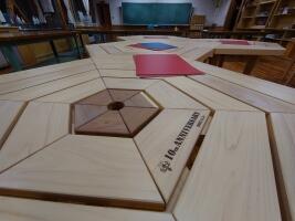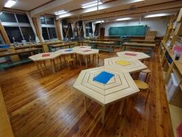 〇12月6日(火) いよいよ学校も冬支度を始めます。中庭のウッドテーブルは、しばらくの間室内で活用します。背パラソルは倉庫に、ウッドテーブルは技術室に入れました。明日の生徒の皆さんの登校を前に、先生方が環境を整えてくれました。ウッドテーブルは室内で使い続けますが、大切に使ってくださいね。