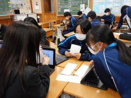 11月14日(火)1年生の国語では、2つの説明文を比較し、「どちらの方が論の展開として説得力があるか」について考え、自分の言葉でまとめていました。2つとも長く、読み応えのある文章でしたが、生徒は色付けをしたり、線をひいたりしながら、内容を整理し、タブレットの付箋ツールに2つの文の「共通点」「相違点」をまとめ、それを基に、自分の考えを400字の原稿用紙に表現しました。「大変だったけれど、比べたり、分析するのが楽しかった」と手応えを感じていた様子の生徒。論理的に、かつ批判的に文章を読むことで、自分の考えを広げ、思考力や判断力、表現力をさらに高めていかれるとよいです。
