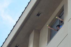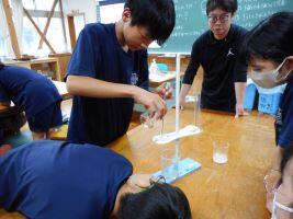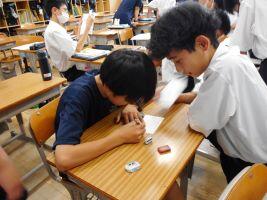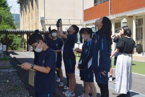 7月17日(水)3年の理科の授業で学習した「等速直線運動」の内容を発展させた「等加速度運動」について学習をしました。この学習は、高校物理の力学の内容へとつながります。本時は、高校物理科のM先生を特別講師としてお迎えし、公式を使って、4階の校舎からボールが落下するのにかかる時間から、校舎の高さを導き出しました。生徒たちは数学で、影を使って校舎の高さを測る方法を学習したことがありますが、ボールを使ってもおおよその高さが測定できることを知り「面白い」と意欲的に実験をおこなっていました。