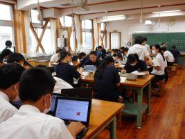 7月4日(木)今朝も自習室が満室でした。高校1年生から中学3年生までぎっしりです。先生方も何人か来て、質問に答えています。チェックテスト(単元テスト)に向けて学習をしている生徒、毎日の日課として朝学習をしている生徒、探究活動のまとめをしている生徒とさまざまです。昼間、高校生の授業の様子を覗いてみると、高校生も落ち着いて授業に取り組んでいました。「(文化祭からの)切り替えの早さに驚かされる」とK教頭先生。オンとオフの切り替えの早さは、これから社会に出ても必ず役に立つと思います。