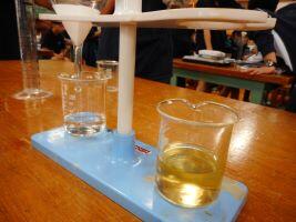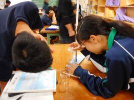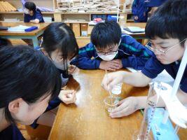 7月12日(金)1年生の理科の授業で、コーヒーシュガーと片栗粉を使って、水溶液の性質について学習をしていました。予想をした後、水を混ぜて実際に溶けるかどうかを確かめ「片栗粉は水に溶けない」ことを確認した生徒たちでしたが、あるグループで新たな議論が・・・「とろみをつける時に使っている片栗粉は溶けていないのかな?」「火を通すと溶けるのかな?」