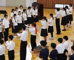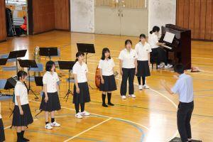 7月16日(火)吹奏楽班、合唱班の大会に向けた壮行会がありました。吹奏楽班、合唱班ともに鳩祭に向けた楽曲練習、大会の課題曲練習と大忙しの3カ月でした。壮行会では、鳩祭での発表よりもさらに迫力のまる演奏を披露してくれました。生徒代表のYさんが「緊張すると思うけれど、楽しむことが大切だと思うので、大会まで精一杯頑張って、当日は楽しんで」と激励の言葉を述べ、エールを送りました。当日、広いホールで気持ちよく演奏をしてきて欲しいです。