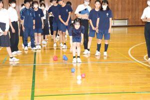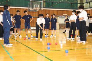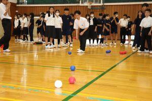 7月17日(水)福祉委員会の企画ボッチャ体験がありました。昨年度までは、昼休みに実施していたものですが福祉委員会で「より多くの人に楽しんでもらいたい」と考え、委員会の空き時間(附属中では参加する委員会によって前半・後半と分かれて活動しています)を利用し、委員会対抗でボッチャを行いました。1年生から3年生まで学年関係なく、自分のチームの球がよい場所に行くと、手を叩いて喜び、盛り上がり、企画をした福祉委員会の正副委員長さんも「盛り上がってよかった」「ボッチャを多くの人に体験してもらえてよかった」と手ごたえを感じていました。縦割りの学年が交流できるよい機会にもなりました。