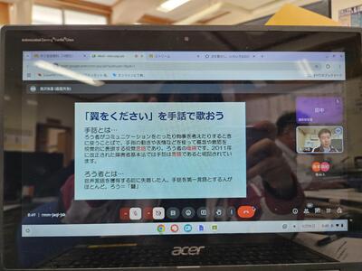 例えば、音楽科の授業では、「翼をくださいを手話で歌おう」を題材に、ろう者の立場で歌を歌う体験をしました。画面上の友達の動きを真似ながら少しずつできるようになっていきました。