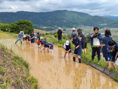 本校では、「千曲市姨捨棚田名月会」の主催で行われている「棚田貸します制度」(棚田オーナー制度)に登録し、姨捨姪石地区の田んぼを一区画お借りして、棚田の保全活動に協力しています。
