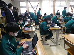 クロムブックに向かってまとめたり、友達と情報交換したりしていました。
