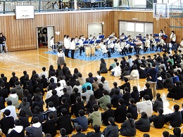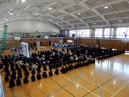 北信大会に出場する運動班の壮行会が行われました。各班の代表2名が全校生徒の前に整列し、応援団による応援、全校による校歌斉唱、最後に、応援団からエールが贈られました。